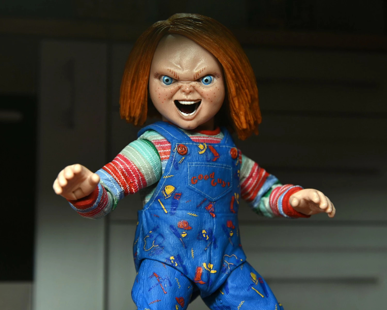 Chucky is back! When a vintage Chucky doll turns up at a suburban yard sale, an idyllic American town is thrown into chaos as a series of horrifying murders begins to expose the town’s hypocrisies and secrets. This Ultimate action figure depicts the murderous doll, inhabited by the soul of a serial killer, as seen in the all-new “coming of rage” TV series, CHUCKY.