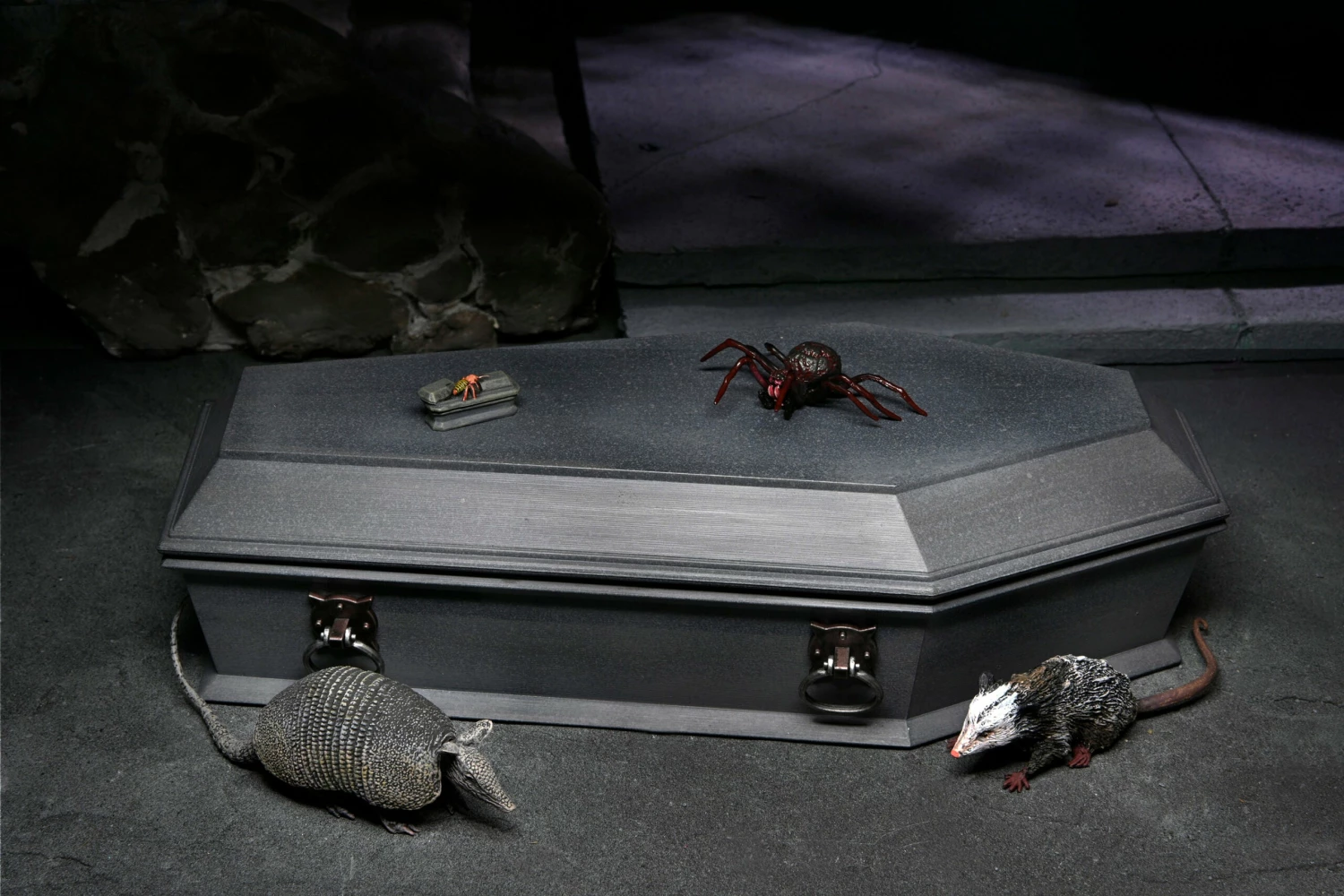 The set also includes armadillo, large spider, cricket in coffin, and opossum accessories. Closed box packaging.
